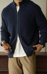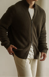 A refined layering essential, designed with a ribbed knit texture for structure and modern appeal. Made from 100% cotton, it offers breathability and lasting comfort through every season. The full-zip closure and high collar add versatility — wear it zipped for a clean, contemporary look or open over a tee for effortless casual refinement. Whether paired with tailored trousers or relaxed denim, this sweater is a timeless piece for every wardrobe.